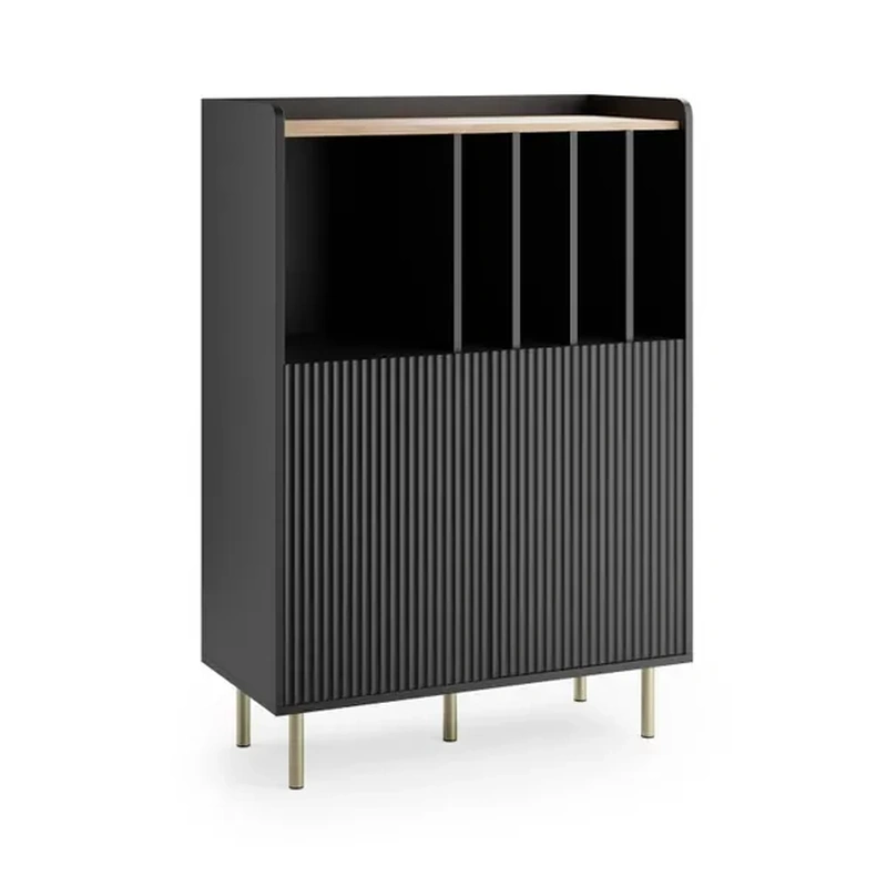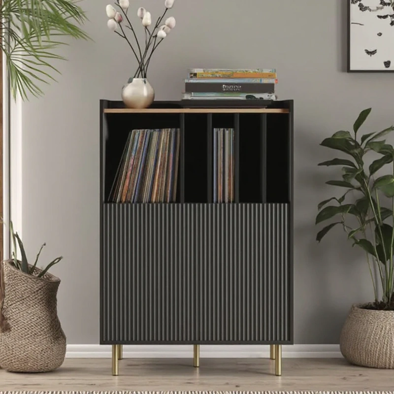 Stylish vinyl record storage cabinet with black and gold accents holding records